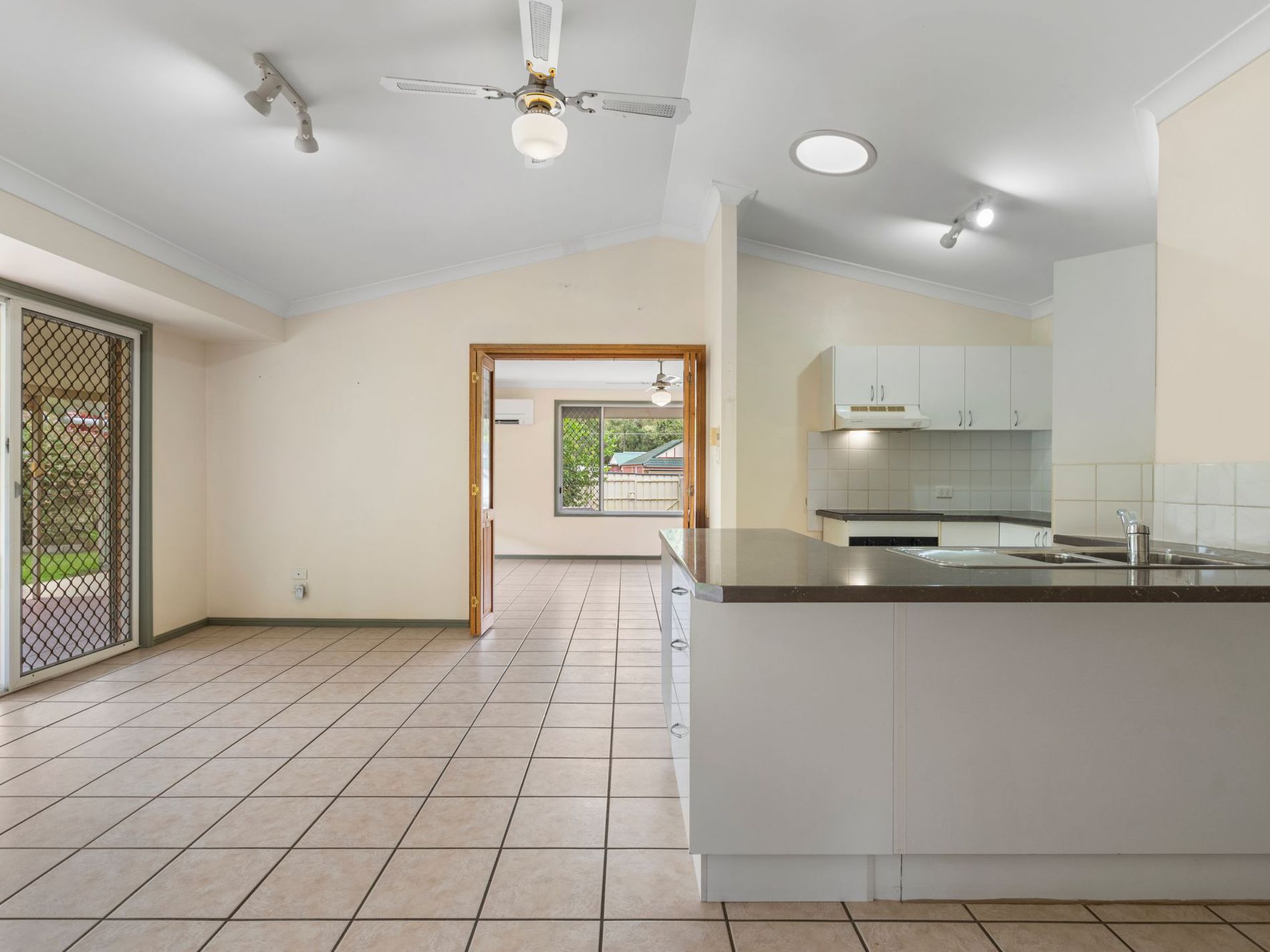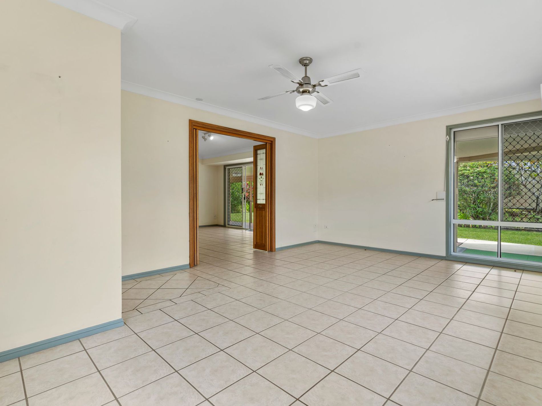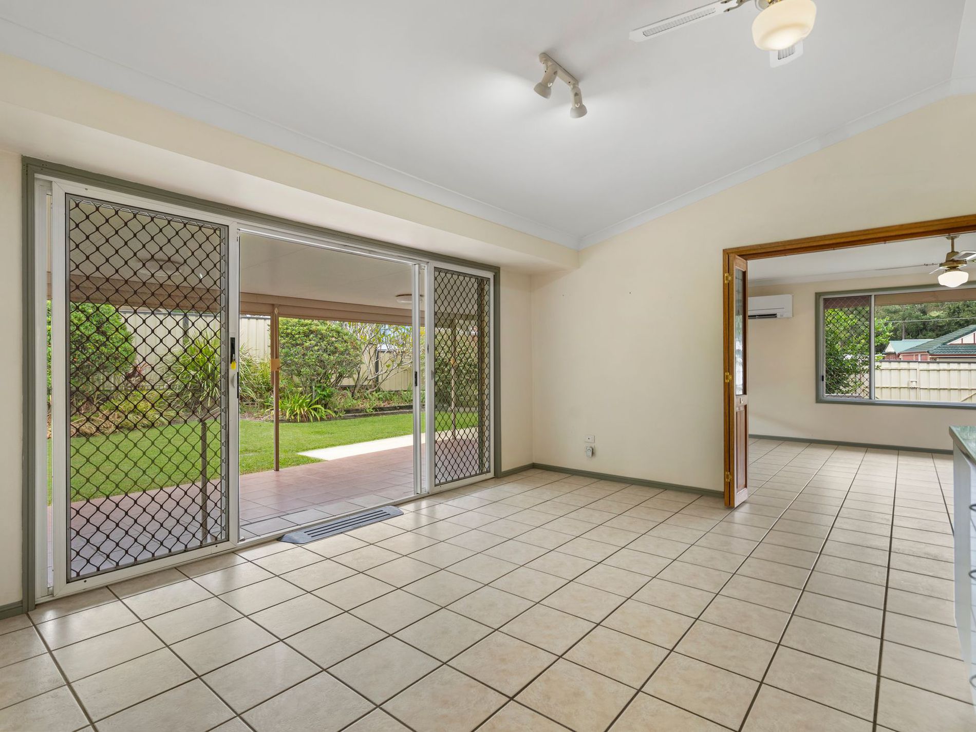 * Bifold doors leading to the living room with air-conditioning and ceiling fan