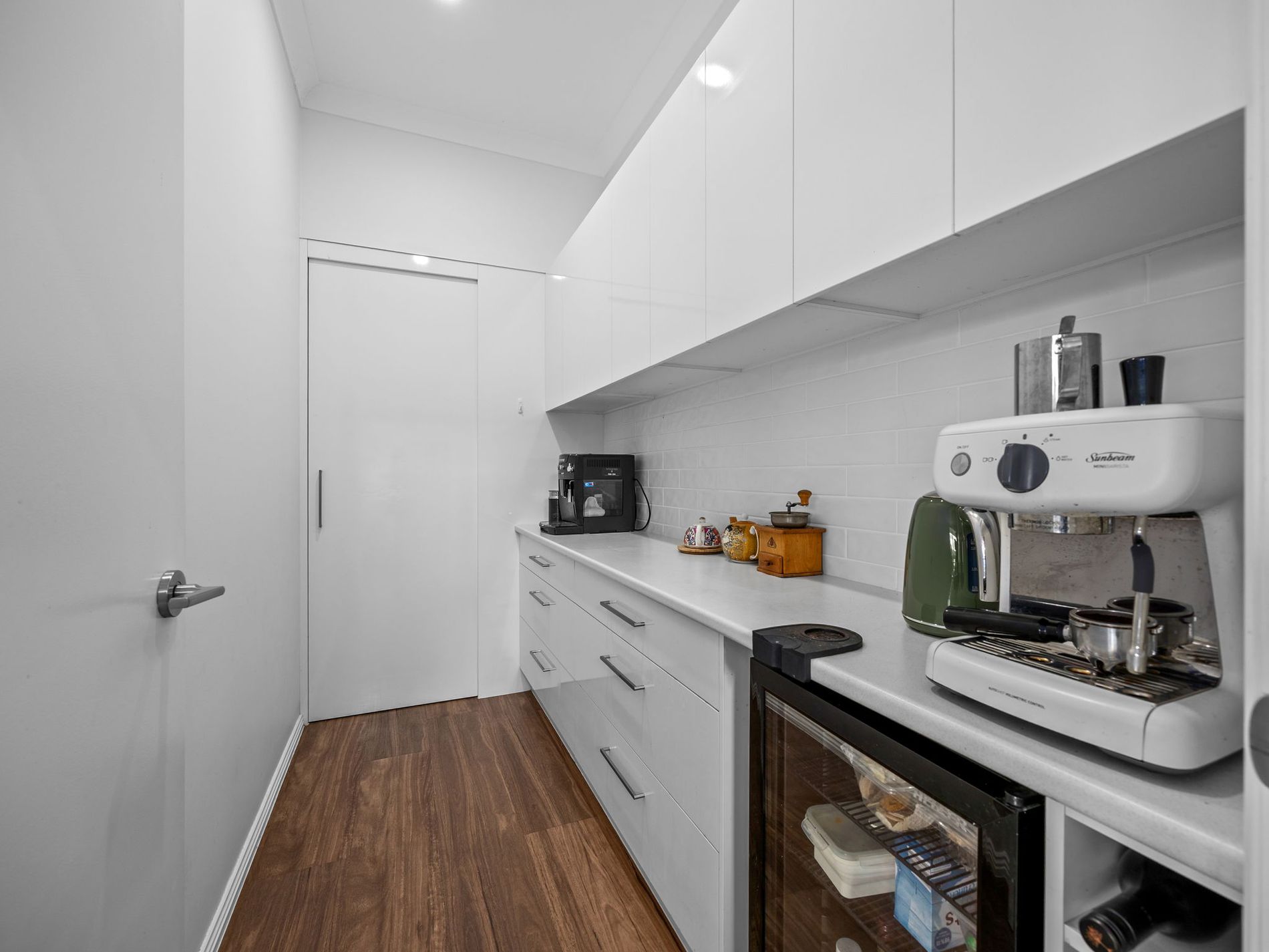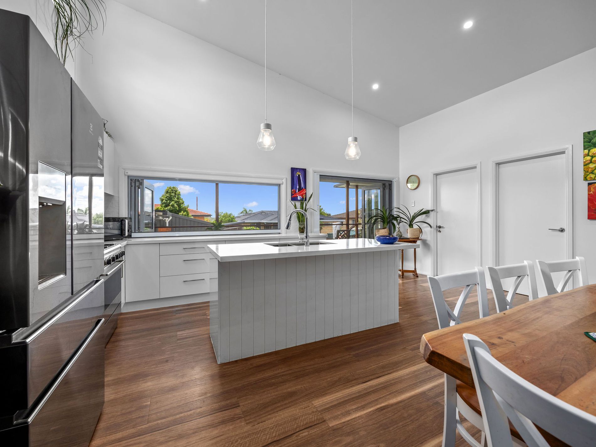 * Stylish kitchen with a gas cooktop, dishwasher, breakfast bar, walk-in pantry, plumbed fridge space and servery windows with retractable insect screens opening to the back deck