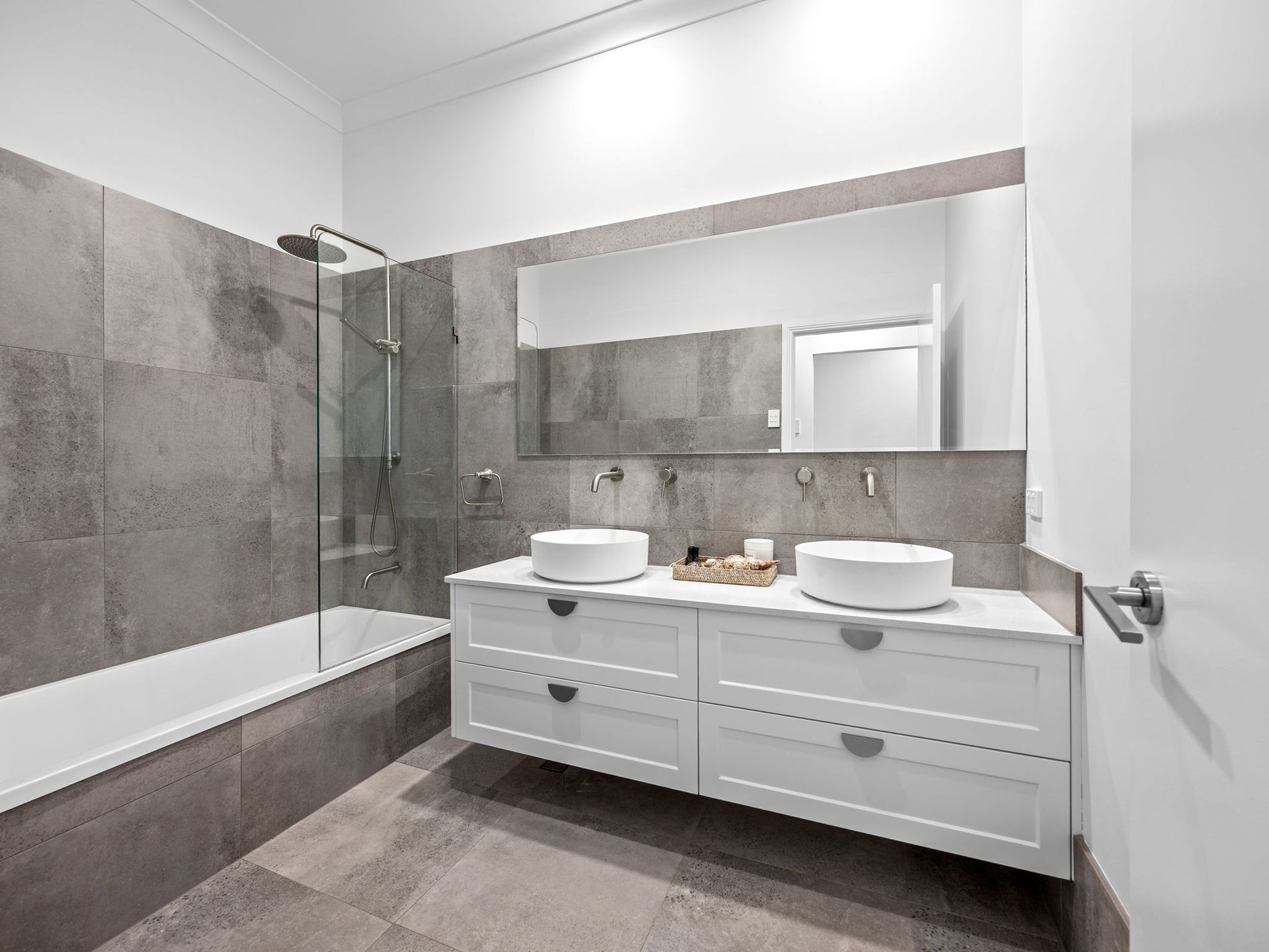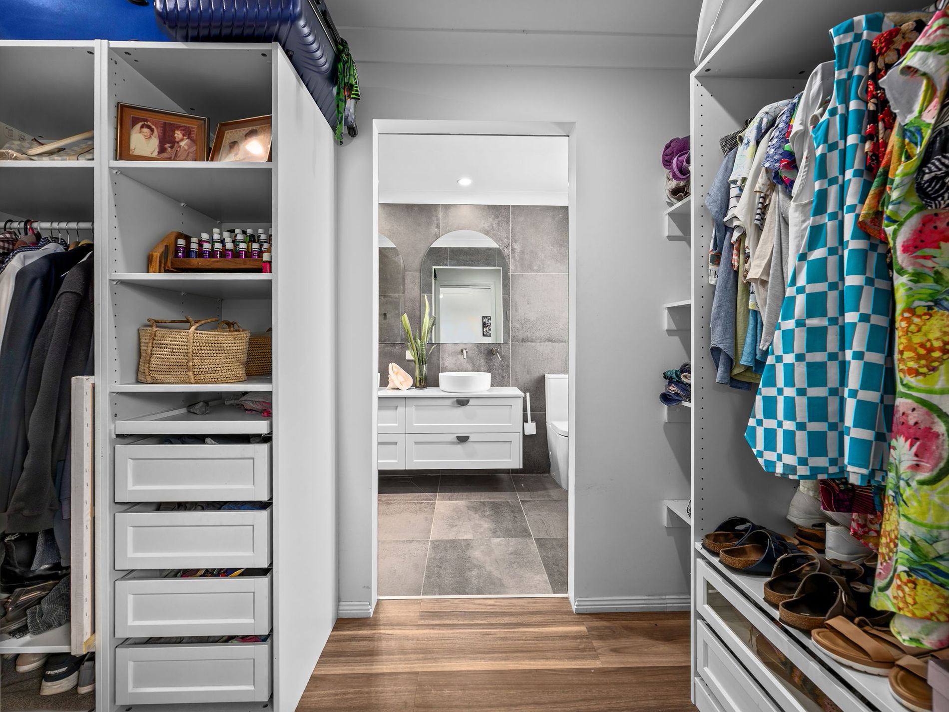 * Air conditioned master suite with a walk in wardrobe with shelving, drawers and hanging space, plus a stunning ensuite bathroom with dual vanities and dual showerheads